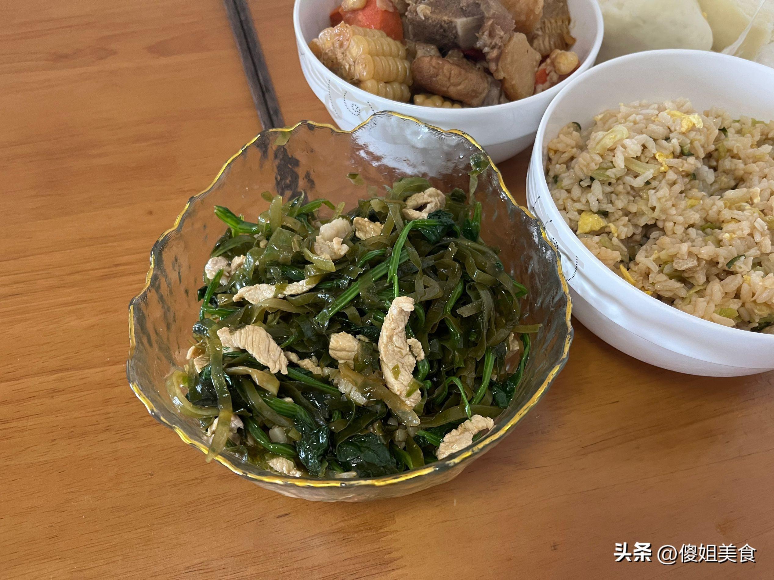 每頓飯我們娘倆都會拌一個涼拌菜,今天做的是海帶肉絲菜,首先把乾的海帶絲泡一下,泡好的海帶絲多清洗幾遍,把裏面的髒東西清洗出來。再準備一塊豬肉絲,洗一下改刀切成肉絲,隨後把豬肉絲放入開水中煮熟,然後再把海帶絲煮熟,把肉絲和海帶放在一個大碗內,放點香油、米醋、鹽、味極鮮、雞精拌均勻,一道爽口好喫的肉絲拌海帶就做好了。