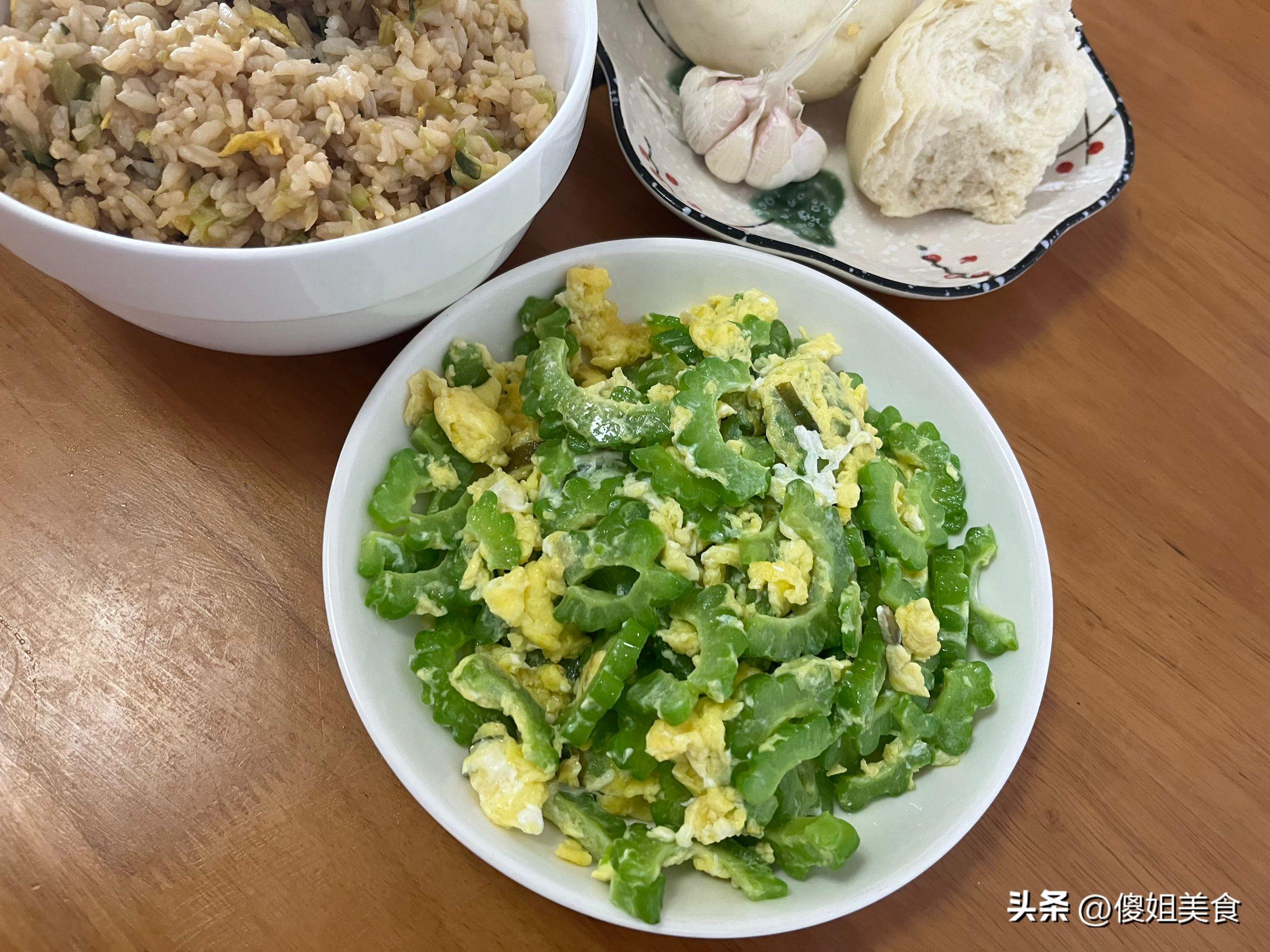 看到這個色澤鮮亮的苦瓜了炒蛋了吧,苦瓜可是純天然無公害的,這是婆婆在我家小院裏一個磚縫裏種的一棵苦瓜,結的苦瓜還不少,上次回家給我帶來好幾根,苦瓜蘸醬喫太苦了,炒雞蛋喫還可以。首先把苦瓜洗淨後一分爲二,用小勺把裏面的種子及白色的瓜瓤取出來,這個白色部分很苦,儘量取乾淨,然後改刀切成段,焯水一下去除苦味,最後將撈出來的苦瓜打入2個雞蛋,放鹽後攪散,直接放入熱油鍋內炒就可以,炒熟後的苦瓜鮮美好喫,一點都不苦,夏天喫很祛火。