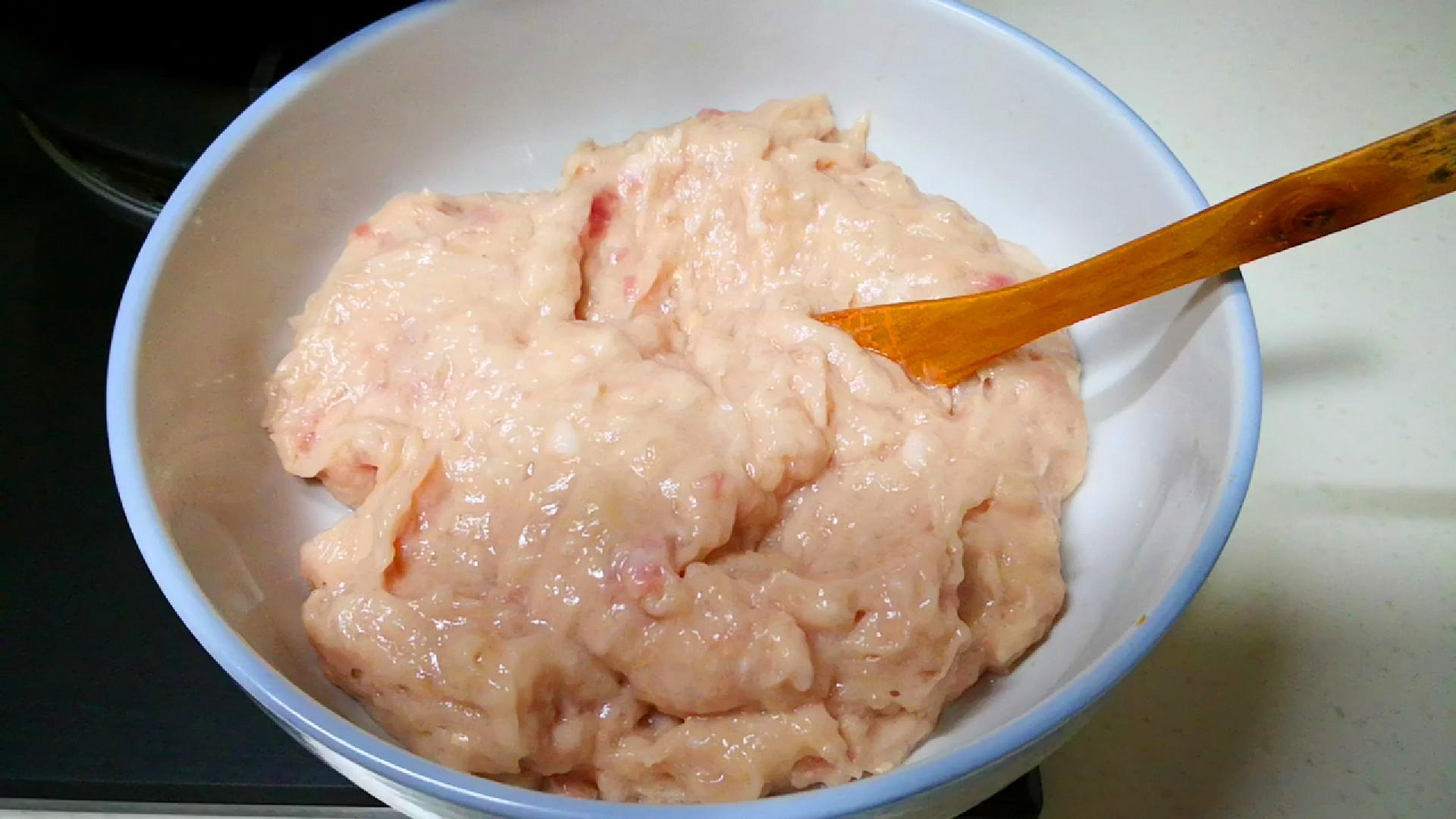3、處理魚餡:準備一塊五花肉,魚餡要想好喫,一定加一點五花肉,五花肉剁成肉餡後加入魚餡,比例是1:3,接着再磕入一個雞蛋,用筷子一個方向攪拌,邊攪拌邊分次少量的加入花椒水,大概攪拌10來分鐘,攪拌成膠狀,魚膠的狀態就是筷子直立在魚餡中而不倒。爲了魚餡更加的鮮美,同時可以去掉腥味,這時候要加入切碎的韭菜,做魚餡餃子一定要加韭菜,這樣做出的餃子纔會特別的鮮美。