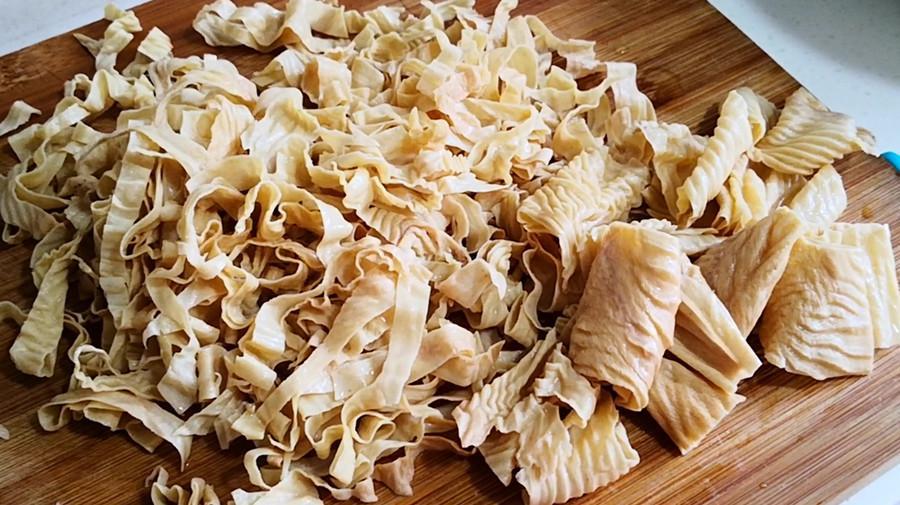 1.先將幹豆腐皮用清水沖洗幾遍,衝去表面的灰塵和雜質,然後放入盆中,加入溫水將其泡軟,一般泡五分鐘左右就會變軟,泡軟即可,不需要泡太久。然後下鍋焯燙一下,1分鐘後撈出過涼水,再擠乾淨水分後切成細條,放入盤中備用。
