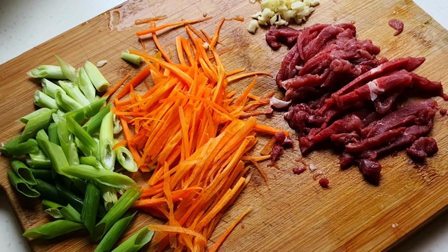 3.再準備適量的蔥段、蒜末、薑末和胡蘿蔔絲備用。