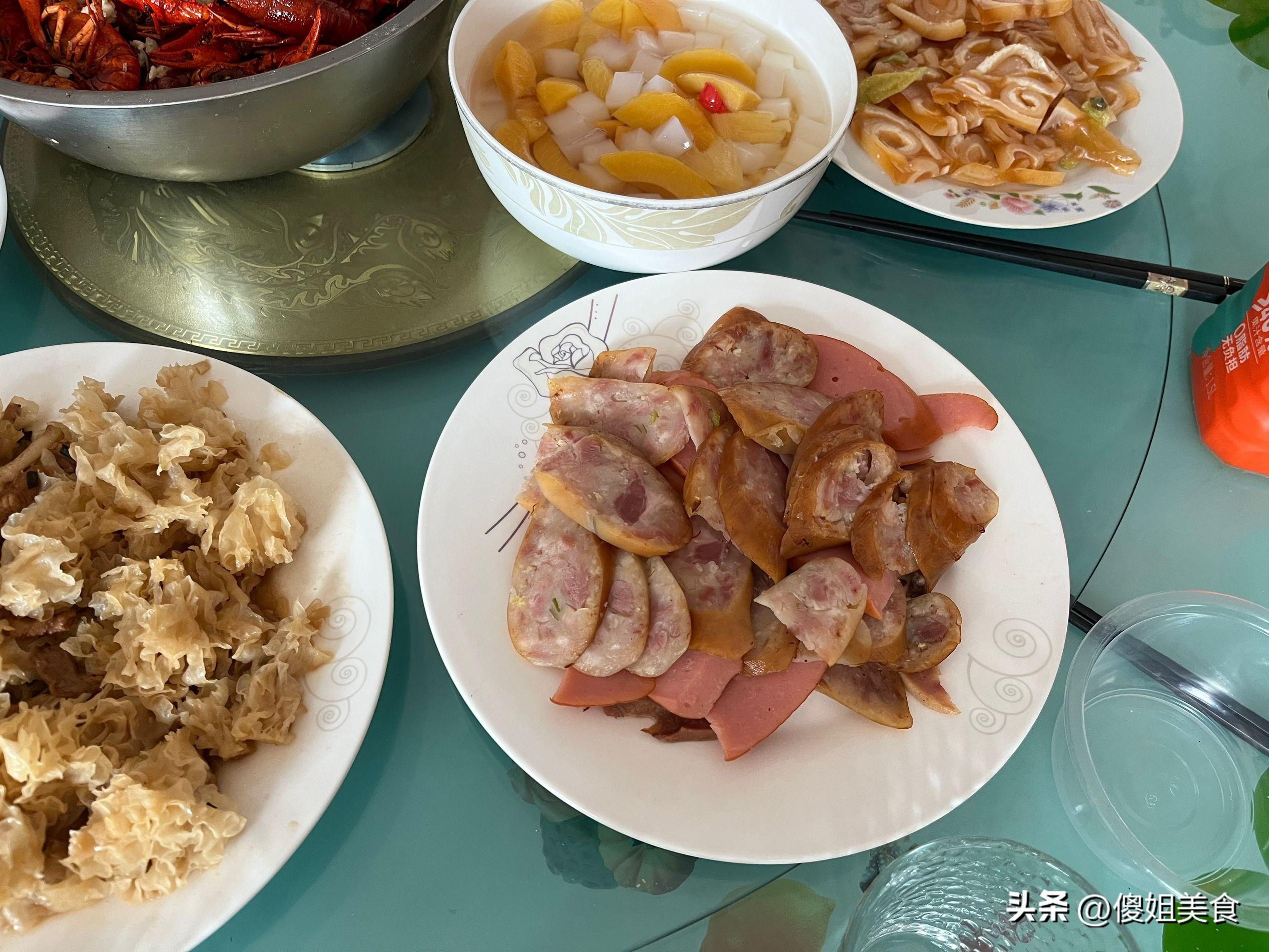 在熟食店還買了人家自己做的肉腸,裏面都是豬肉的,買了兩種口味拼了個盤,隨手切成薄片,端上餐桌就能喫,簡單又省事,蘸着蒜泥醋汁喫,一口一片很過癮。還買了個肉皮凍,藤椒口味的,全家人都愛喫。天這麼熱再來一份黃桃罐頭,這一桌子菜簡直是太有食慾了。兒子一直給女朋友夾菜,兩個人有說有笑的,我看着都開心。閨女一直誇阿姨做的飯好喫,還告訴我不用這麼麻煩招待她,都是自家人。