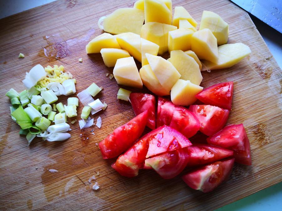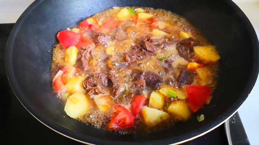 6.牛肉燉好以後撈入盤中備用。再起鍋加少許食用油,油熱後放入薑末和蔥花,炒香後再放入之前切好的西紅柿和土豆塊,翻炒至西紅柿出汁後再加入適量的鹽,然後下入牛肉塊,並倒入適量的燉牛肉原湯,蓋好鍋蓋小火慢燉,讓土豆和西紅柿吸收湯汁後充分入味。
