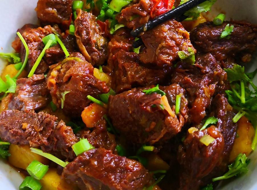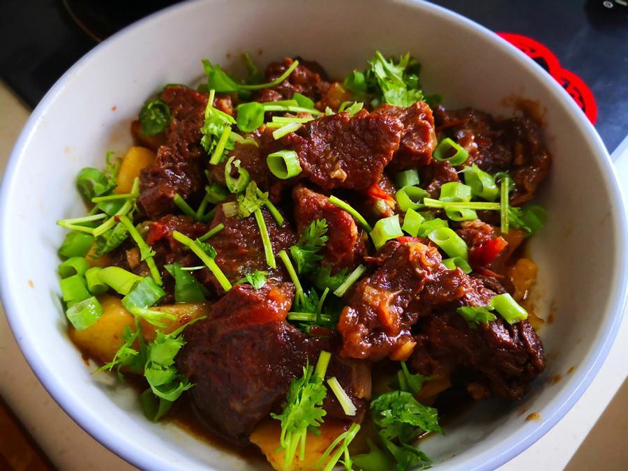 7.燉至土豆變軟爛後,再將火調大,大火收汁後撒上一點香菜和蔥花,便可以出鍋裝盤了,真香啊!