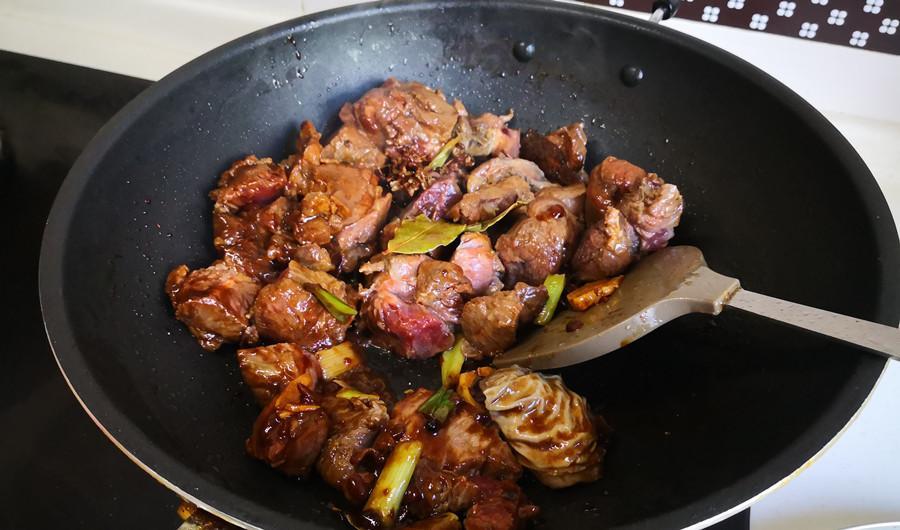 4.起鍋加油,放入一顆八角、一小把花椒、幾片香葉、一小塊桂皮和白芷,還有適量的薑片和蔥段,炒香後再下入牛肉塊,翻炒片刻,炒幹牛肉表面的水分後,再加入1勺黃豆醬、兩勺生抽、1勺料酒、適量的白糖、鹽和少許老抽,翻炒均勻後再倒入沒過牛肉的開水。