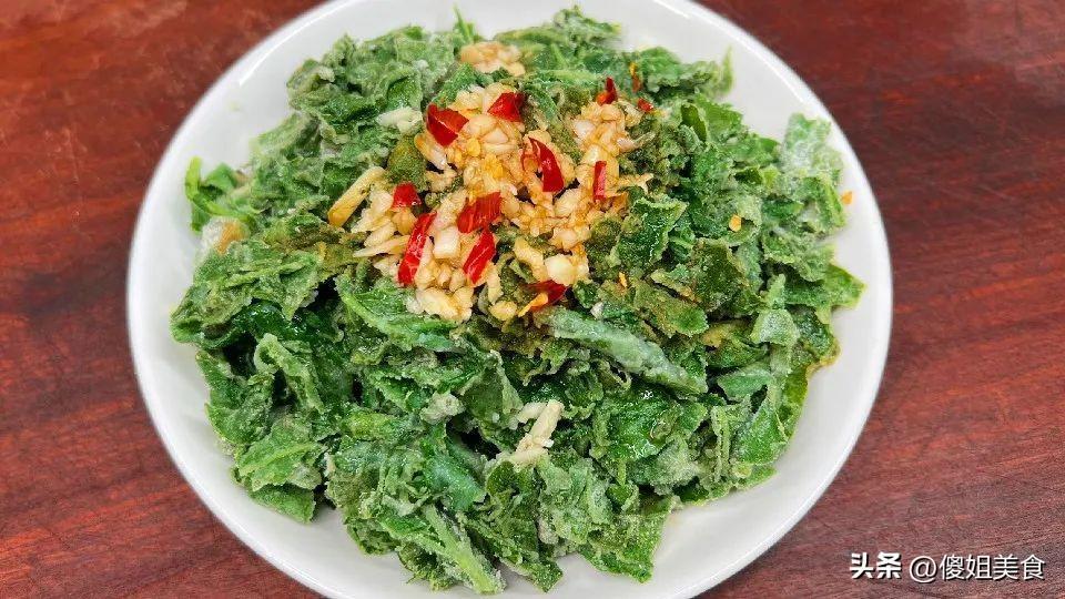 所需食材:新鮮南瓜葉若干、麪粉適量、鹽、雞精等調味料、蒜末、辣椒等配料(可選)
