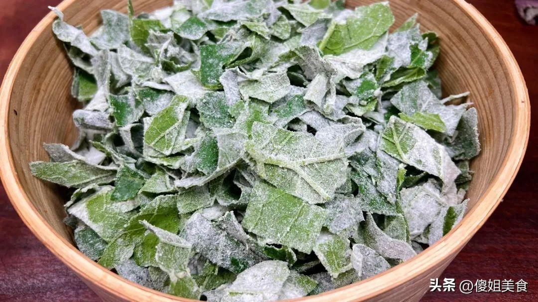 2、裹麪粉:將適量麪粉倒入盤中,加入少許鹽和雞精拌勻。然後,將每一片南瓜葉輕輕裹上一層面粉,確保葉子兩面都均勻覆蓋。
