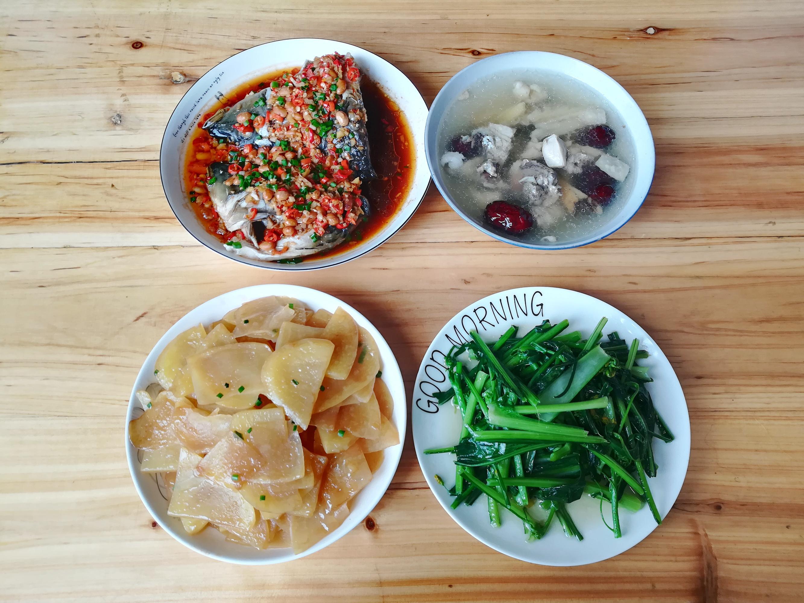 第二天:黃豆醬蒸魚頭、紅棗土雞湯、素炒土豆片、素炒菜心。