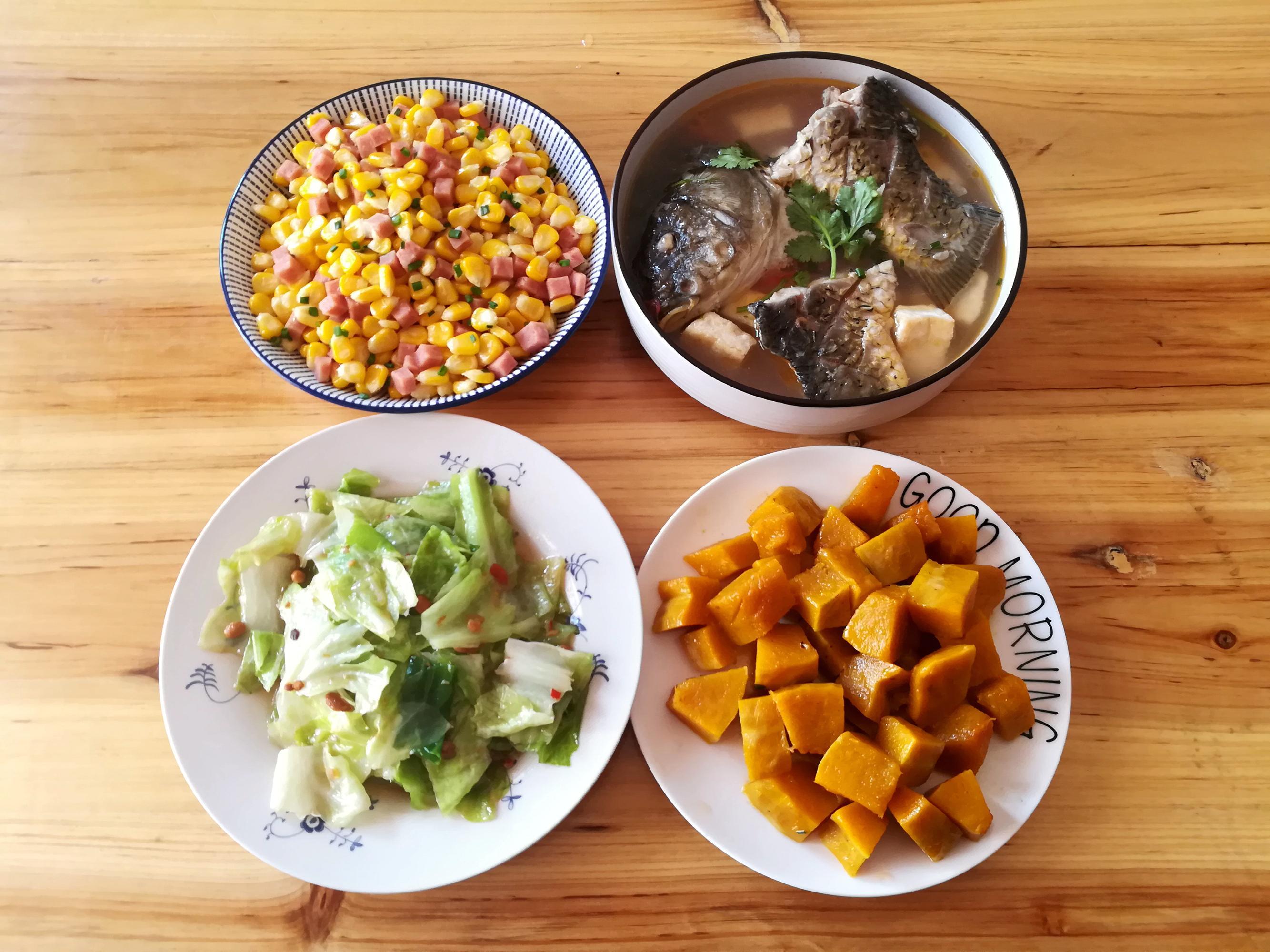 第三天:魚肉豆腐湯、午餐肉炒玉米、黃燜南瓜、素炒包菜。