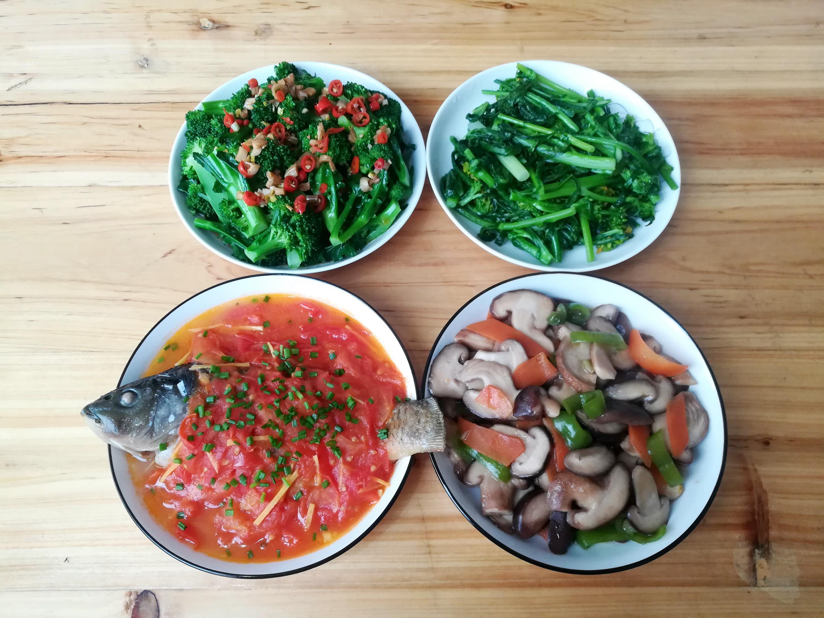 不知道是不是巧合,最近每天都是各種魚。禾花魚原本是想做紅燒的, 但是煎魚的時候魚皮破了,於是加了一個番茄,炒到軟爛出汁,再澆到禾花魚身上,蒸6分鐘撒上蔥花,喫起來很美味。香菇和肉片簡單炒炒,喫起來就很美味。涼拌的西蘭花,加一點辣椒,喫起來更爽口。