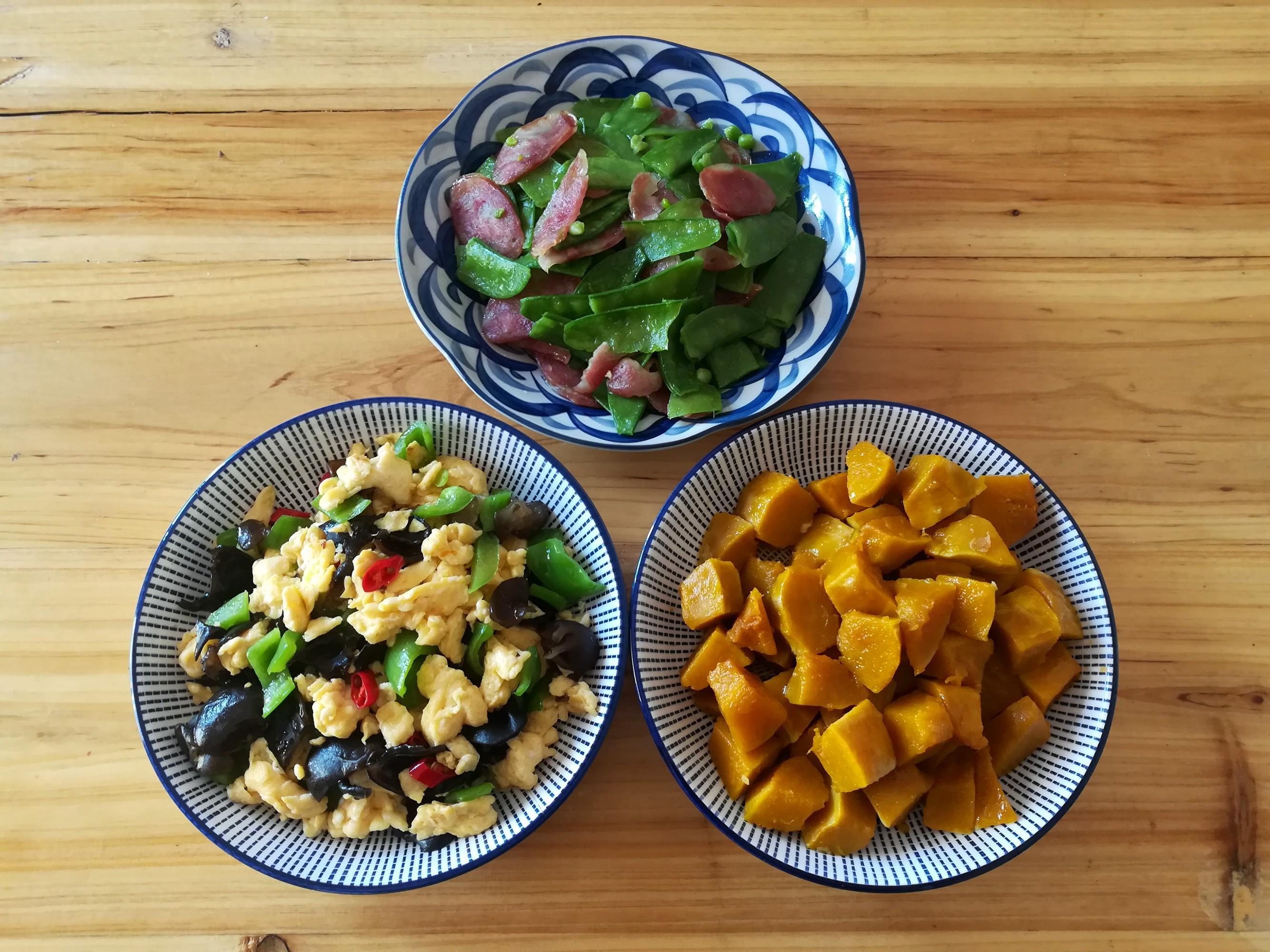 第一天:荷蘭豆炒香腸、雞蛋炒木耳、黃燜南瓜。
