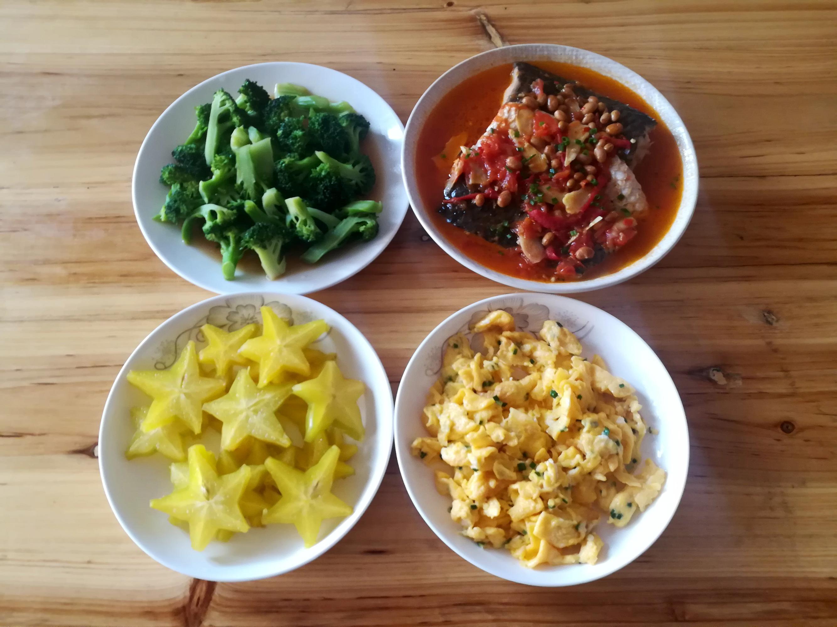 第四天:茄汁蒸魚肉、香蔥煎蛋、素炒西蘭花、水果楊桃片。