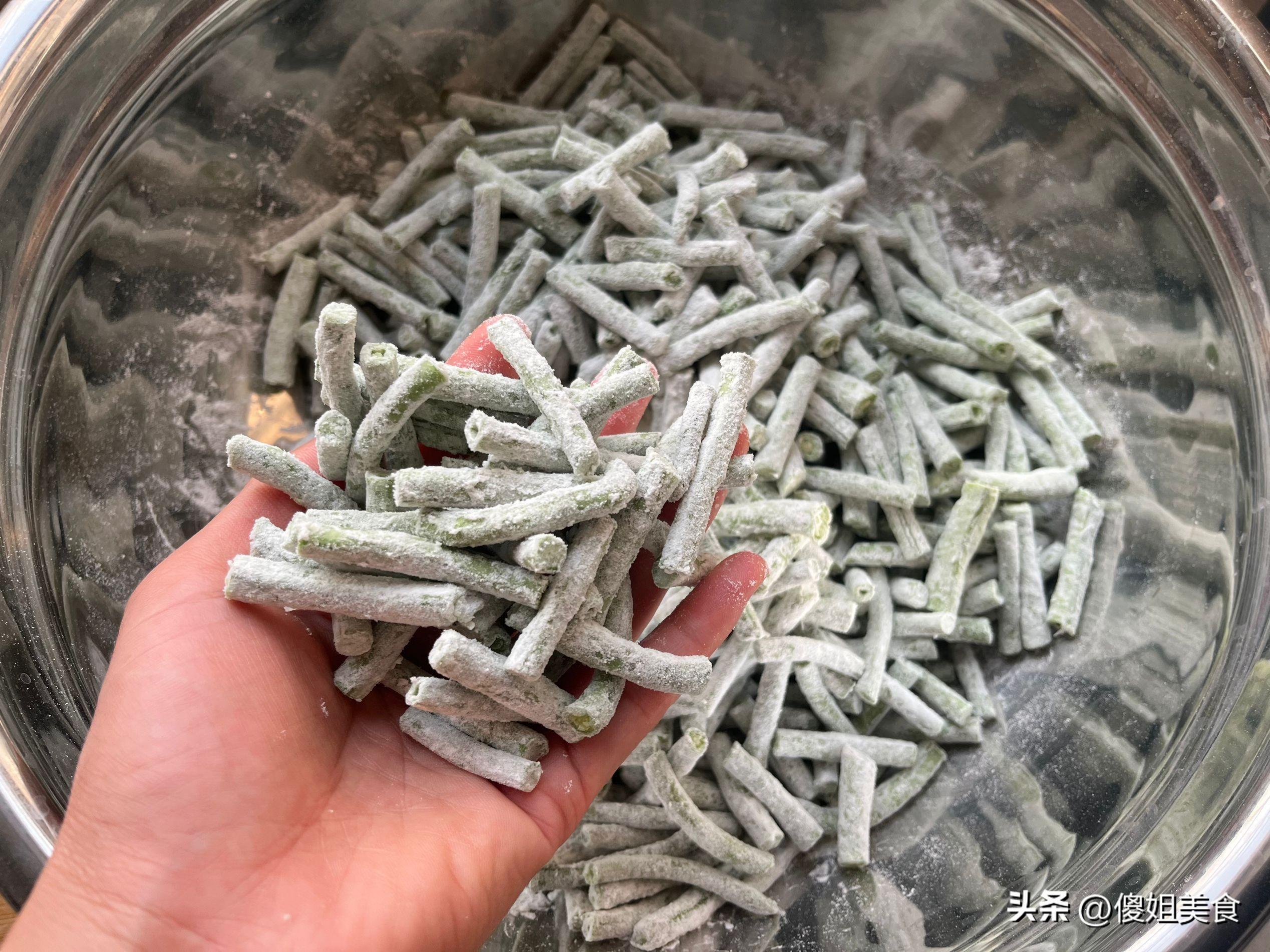取一碗乾麪粉撒在豆角上,下手攪拌一下,使每個豆角段上都裹滿乾麪粉,麪粉一定要少量多次的放,每放一次就不停的攪勻,像下圖一樣就可以。