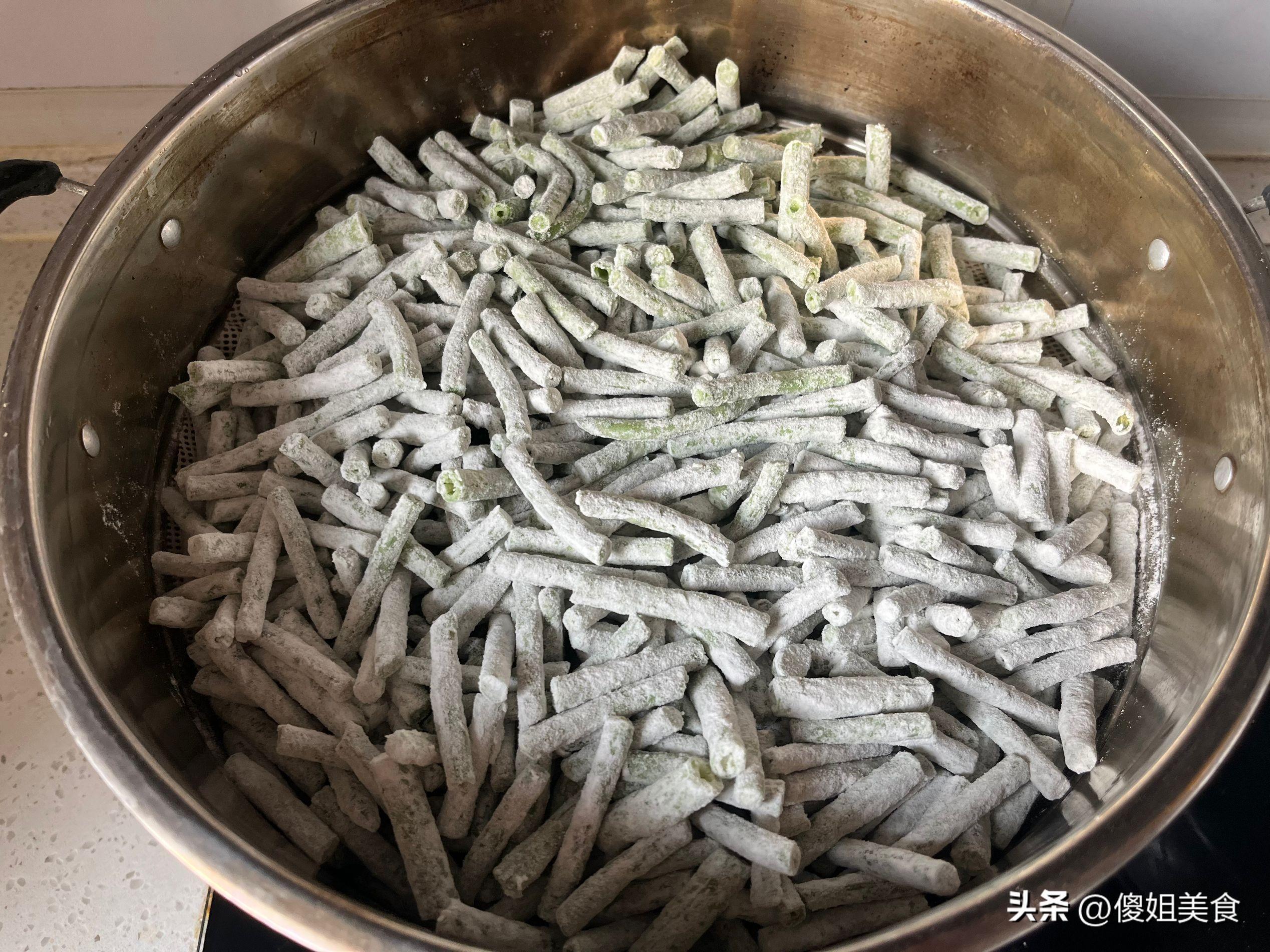 把裹滿面粉的豆角倒在蒸屜上,蒸屜下面放一塊蒸布避免豆角蒸熟後粘在蒸屜上上面,開大火蒸10分鐘,豆角蒸熟後要用筷子攪拌一下,不然會全部粘連在一起。