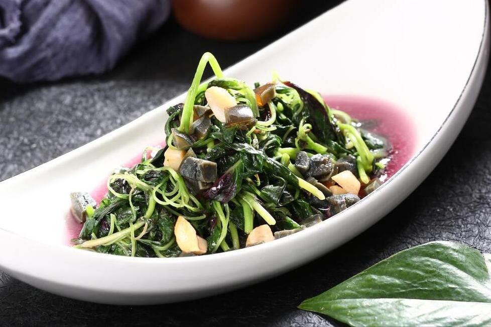 食材:莧菜、皮蛋、大蒜、鹽、雞精、料酒、食用油