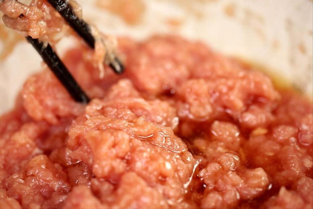 2、最好多泡一會兒,因爲海蓬菜有一股澀味,這樣泡一下會減少很多。趁着浸泡的功夫,我們將肉餡處理好,準備肥瘦相間的豬肉,洗淨以後放在絞肉機中絞碎,然後再往裏面倒入半碗花椒水,繼續充分攪打,直至攪打至上勁。