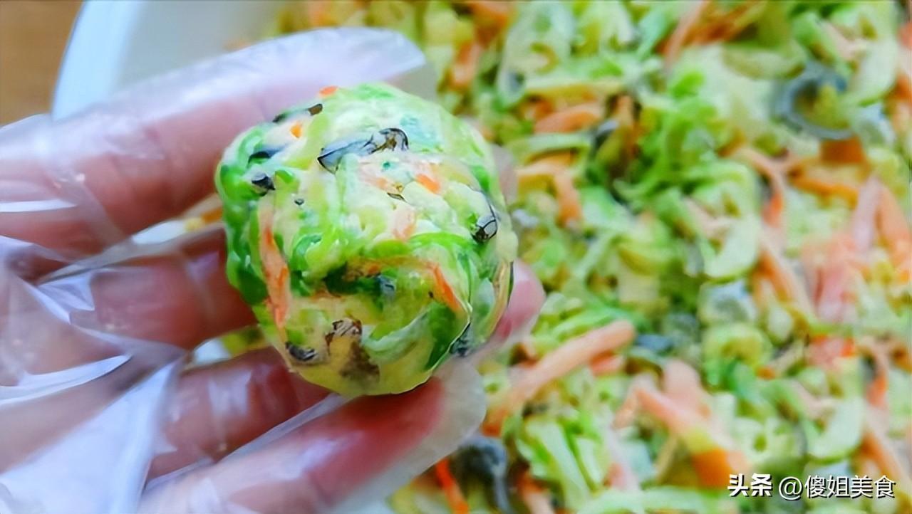 - 製作菜糰子:將調好味的捲心菜餡料團成小球狀,然後在麪糊中滾一圈,讓其表面裹上一層面糊。