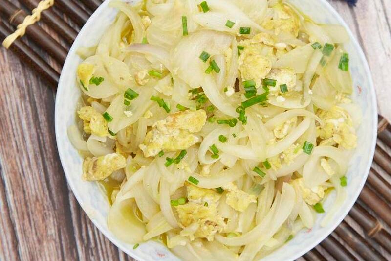 洋蔥洗淨後切絲,雞蛋打散,蔥花切碎。鍋中倒油,燒熱以後先把雞蛋炒出來,接着再來點油,燒熱後先把蔥花炒香,接着下入洋蔥翻炒,炒到變軟以後,把炒碎的雞蛋重新倒在裏面,然後用鹽和雞精調味,炒勻出鍋。