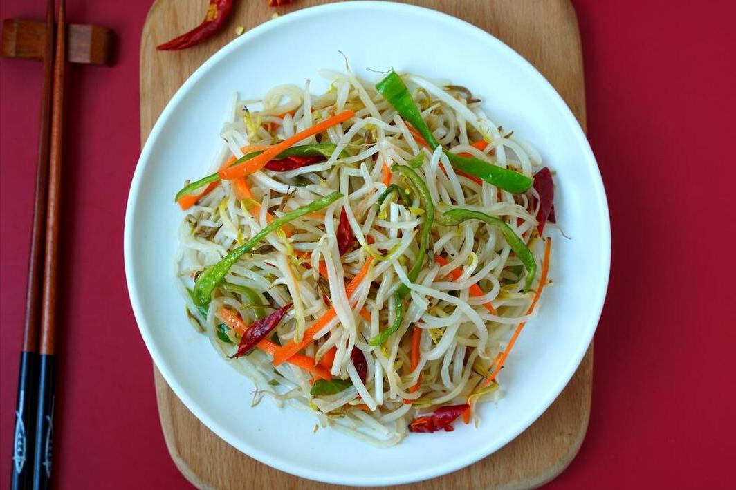 食材:綠豆芽、小米椒、尖椒、蔥花、白醋、生抽、鹽、雞精、食用油