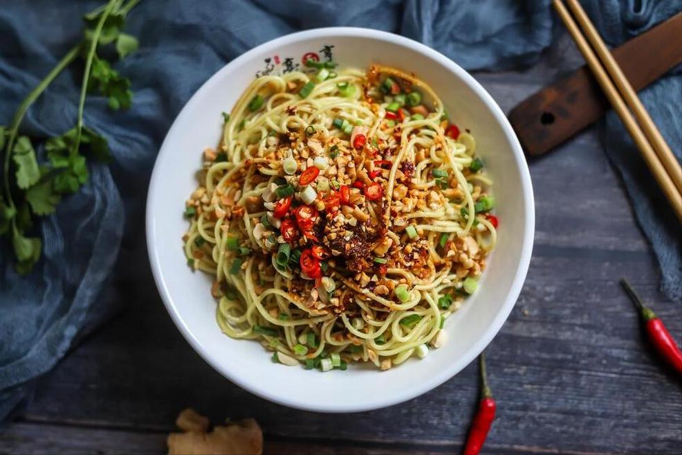鍋中倒水,燒開後先來1勺鹽,接着下入麪條,大火煮上一會兒,大概4、5分鐘的時間,就可以關火了。提前準備一盆涼開水,等麪條煮熟以後,撈出來倒在清水中過一下,即可開喫。