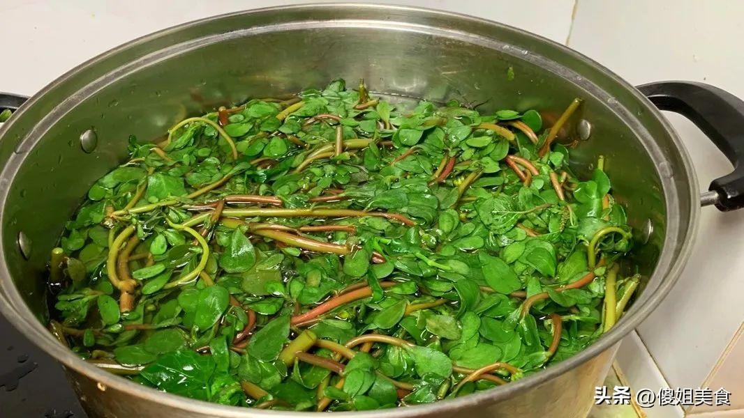 - 焯水:將清洗乾淨的馬齒莧放入開水中焯燙一下,變色後立即撈出,過冷水後瀝乾水分。