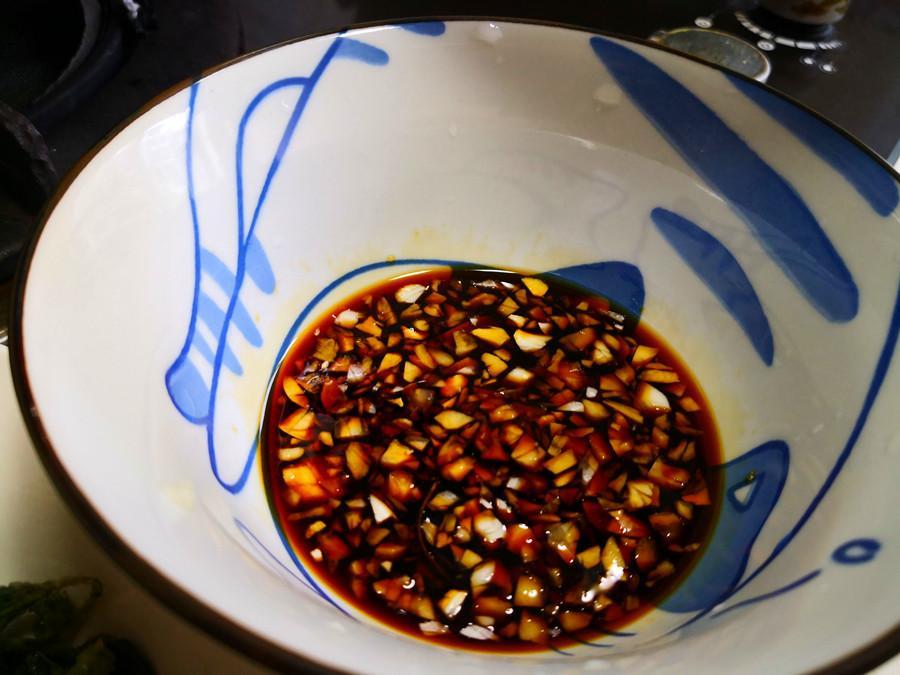 4.在蒸菜的時候,我們來準備個料汁:大蒜拍扁剁細後放入小碗內,再分別加入一勺生抽、半勺米醋、適量麻油和少許香油,攪拌均勻即可。