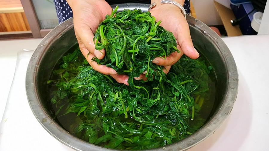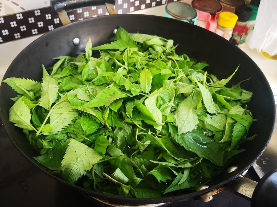 提前燒一鍋開水,水開加一小勺食鹽,然後放入鬼針草焯一下水,時間不要太久,大約30秒後即可撈出,快速將其放到冷水中過涼,以保證其鮮嫩的口感和脆綠的顏色。鬼針草焯水是爲了去除它含有草酸,以及減輕它青澀的異味。