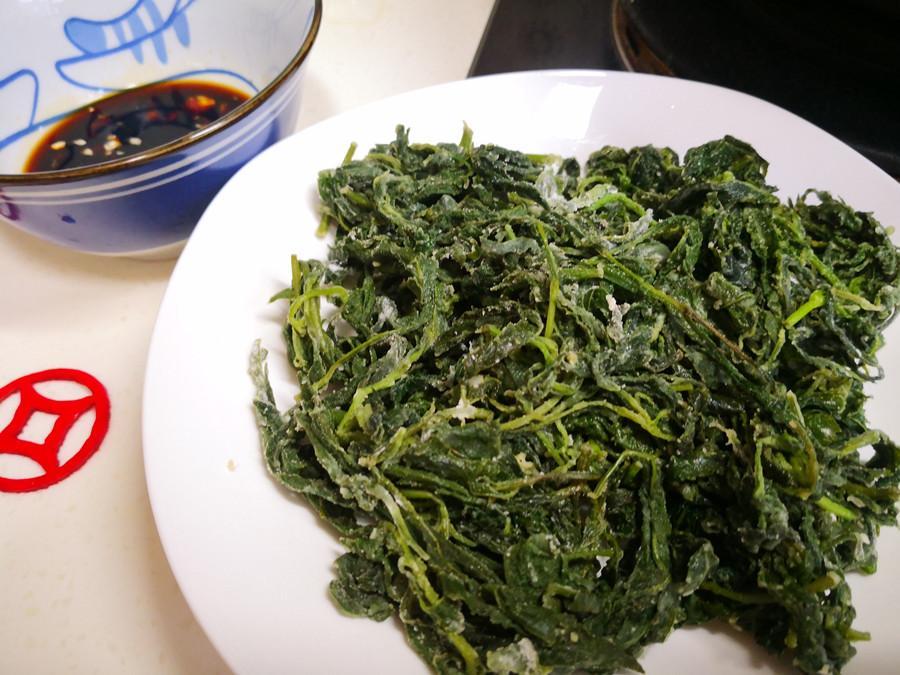 5.大約蒸8分鐘左右,鬼針草就蒸好了,開鍋後用筷子將挑起蒸好的鬼針草,讓熱氣散開的同時,將其抖散放入盤中,接着倒上我們剛剛調好的料汁,或是蘸着料汁喫也可以,鮮香軟糯的蒸鬼針草就做好了,好喫極了!