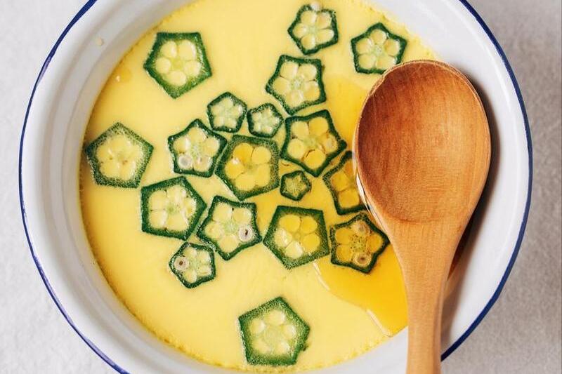 食材:秋葵、雞蛋、溫水、生抽、香油