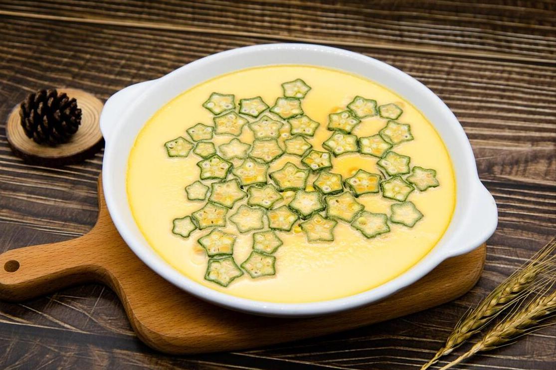 3、切好的秋葵,將其倒在蛋液中即可,不需要攪拌了,直接讓秋葵飄在上面就行,然後在上面蓋上保鮮膜,扎幾個小孔。接下來鍋中燒水,水開之後放入秋葵蛋液開始蒸,隔水蒸10分鐘後,就可以出鍋開喫啦,淋上生抽和香油,味道更豐富。