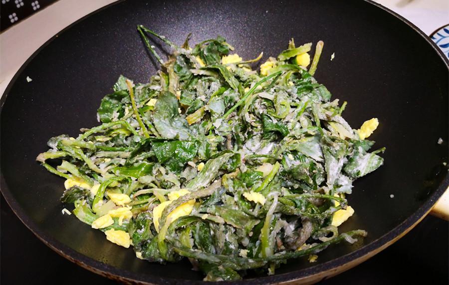 3、趁着蒸車前草的空檔,我們準備兩個雞蛋,順着一方向打散備用,再準備一些蒜末,適量多一些。起鍋加油,油溫五成熱倒入打散的雞蛋,邊炒邊用筷子攪成大小均勻的雞蛋塊後盛出,再利用鍋裏的餘油倒入蒜末翻炒,炒出蒜香味後倒入蒸好的車前草,繼續翻炒片刻後倒入雞蛋碎,加入一匙食鹽,翻炒均勻後即可出鍋,美味即成!