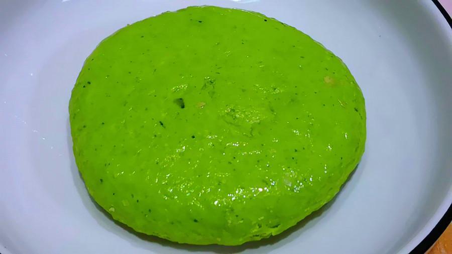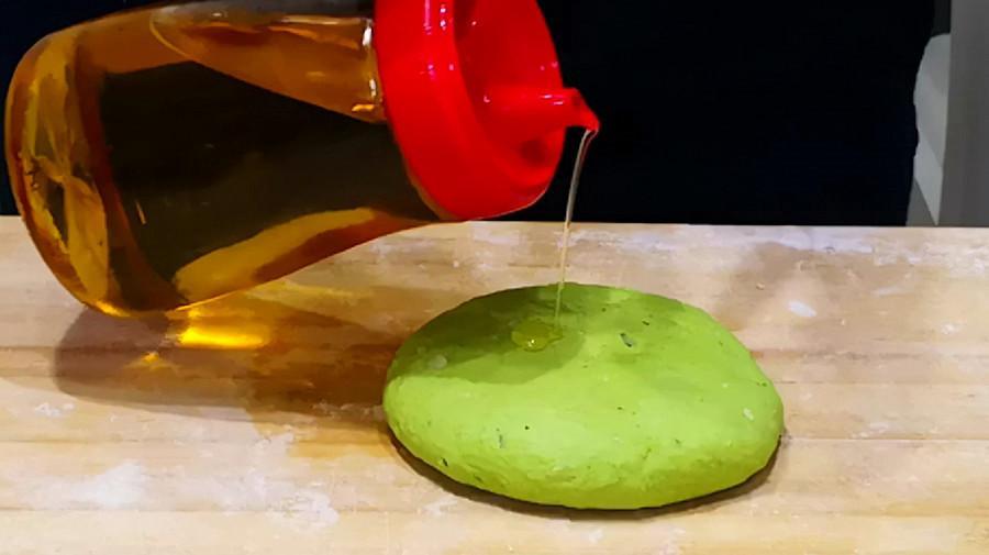 2、挖適量的面飯,加入一點鹽,目的是使得面更有筋道,然後用菠菜汁和麪,分少量多次倒入,面調至絮狀,下手揉麪,揉成光滑的麪糰後,拿到案板上再揉2~3分鐘,然後按成麪餅,倒入食用油使整個麪糰都裹上食用油,這一步是關鍵,加入食用油的目的是增加面的延展性,這樣才能揪出面片,不至於一揪就斷。然後醒面20分鐘。
