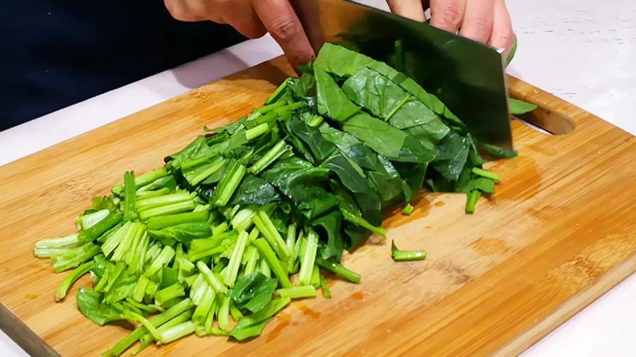 1、買回來的菠菜要摘一下,去掉老葉和黃葉,然後清洗乾淨,切掉根部,切成小段備用,其中一部分打菠菜汁,另外一部分用作配料用。