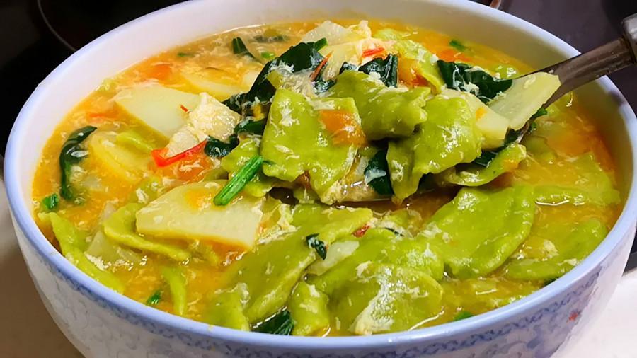 4、鍋開後轉小火,開始揪面片,面片煮熟後,淋入一個蛋液,邊淋邊攪拌,形成均勻的蛋花,然後加入一勺鹽調味,加入留下的菠菜,再次燒開後關火出鍋。
