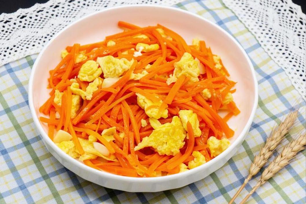 2、然後重新起油鍋,爆香蔥花之後,倒入胡蘿蔔絲翻炒,炒上幾分鐘直至變軟後,加上適量的鹽、雞精調味,然後再把雞蛋重新倒進去,擠上一點點蠔油提鮮,將其翻炒均勻以後,就可以出鍋開喫啦。