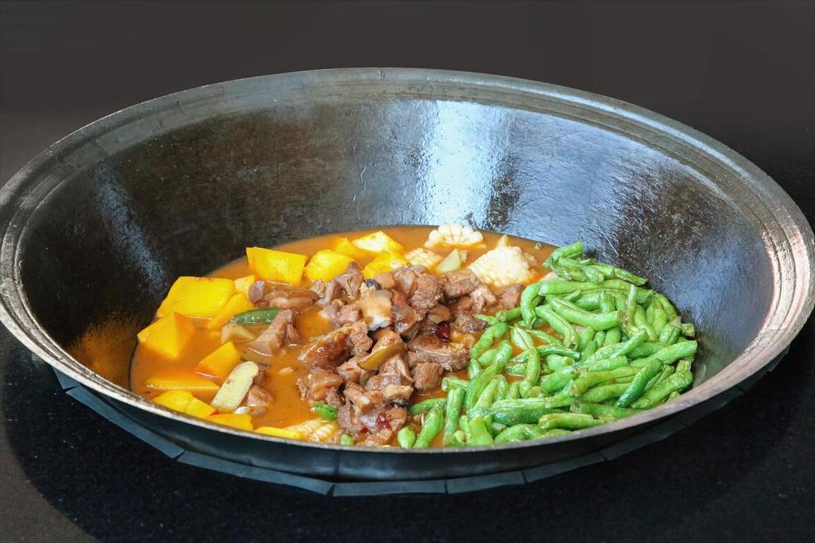 3、接着改爲小火燉1個小時,然後就可以將豆角、土豆放進去了,繼續燉20分鐘後,加上適量的鹽、雞精來調味,把湯汁大火收一下,即可出鍋開喫!