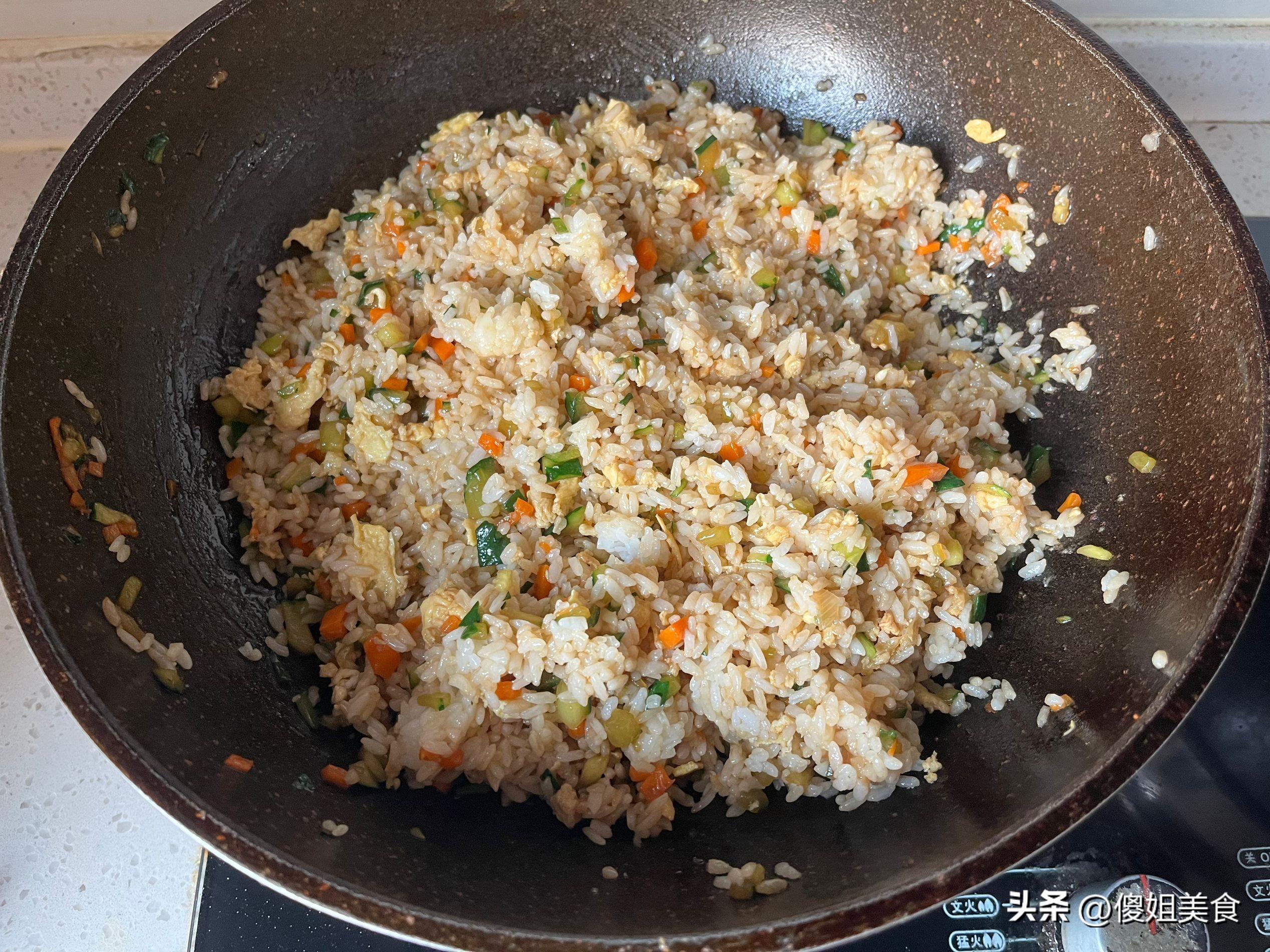 剩米飯會發硬,所以往裏面倒入適量水,把米飯拌軟一些,最後把米飯倒入炒勺內,中火不停翻炒,使米粒炒入味,炒熟的米飯粒粒分明。