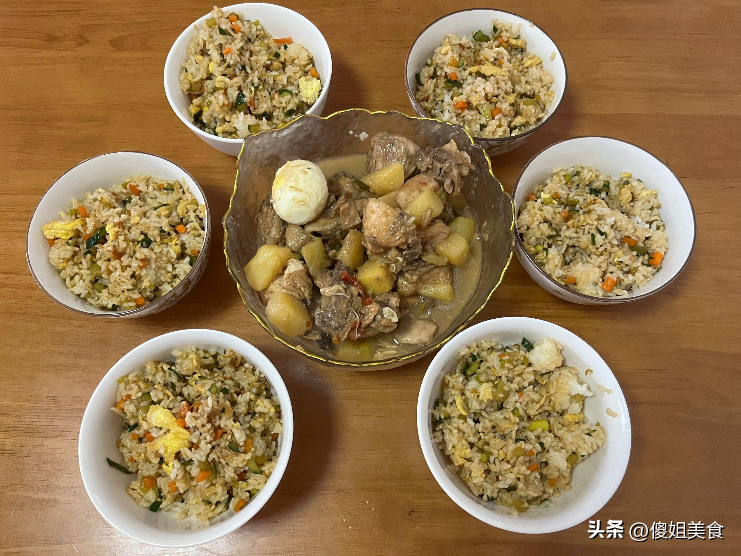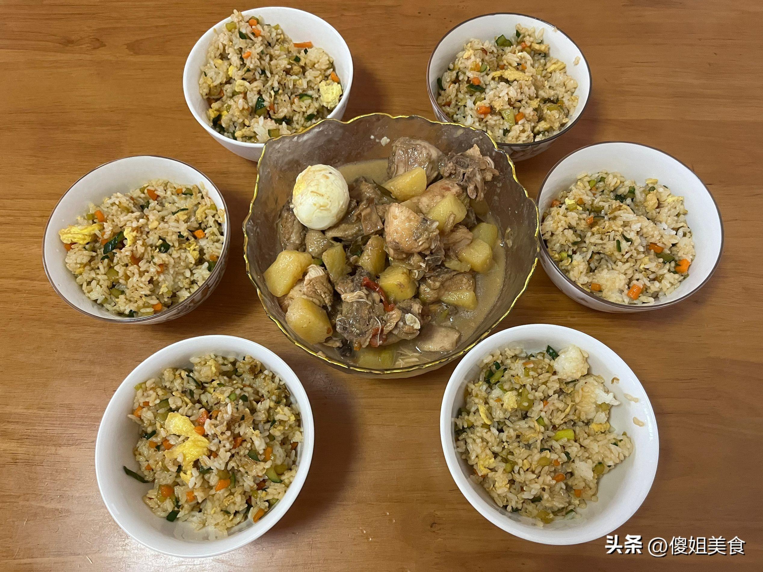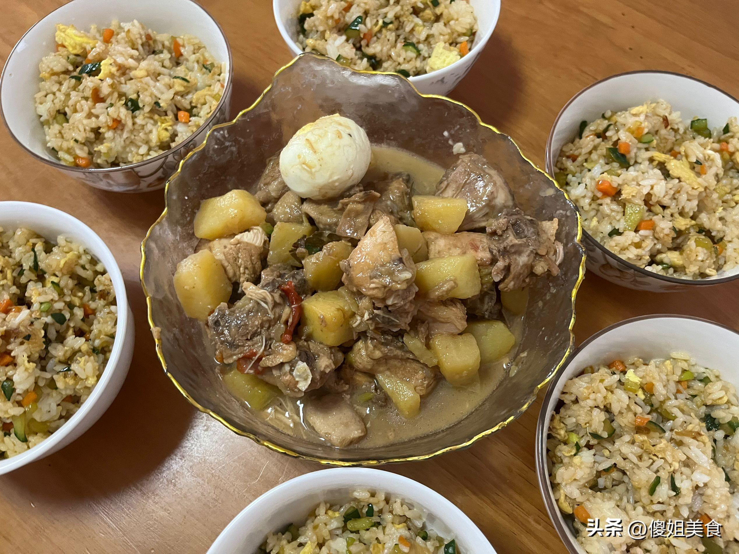 香噴噴的蛋炒飯,盛入碗內,一人一碗,喫起來鮮香美味,再來一碗婆婆燉的小笨雞,一家人的午餐飯簡單好喫又營養,味道絕了。