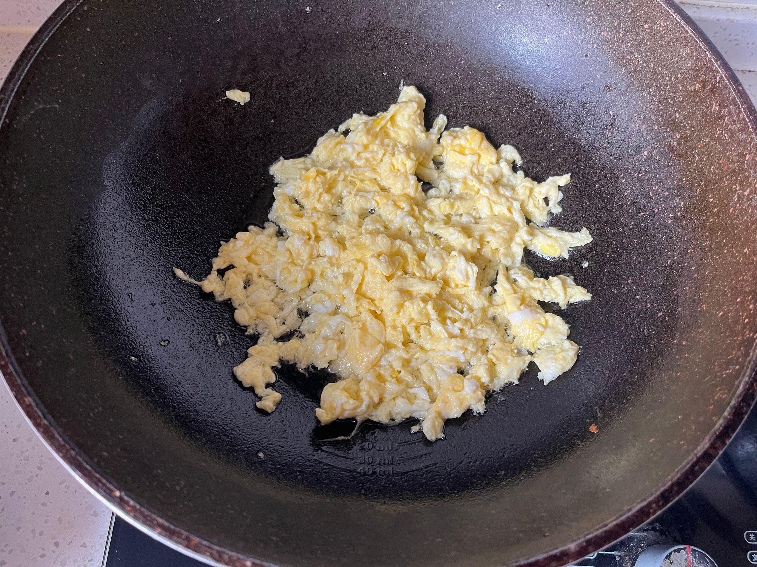 再準備3個雞蛋,(我家雞蛋都是婆婆家養的雞下的蛋,正兒八經的土雞蛋)打入小碗內攪散,放入6分熱的油鍋內,用筷子不停翻炒,把雞蛋攪碎炒熟後盛出。