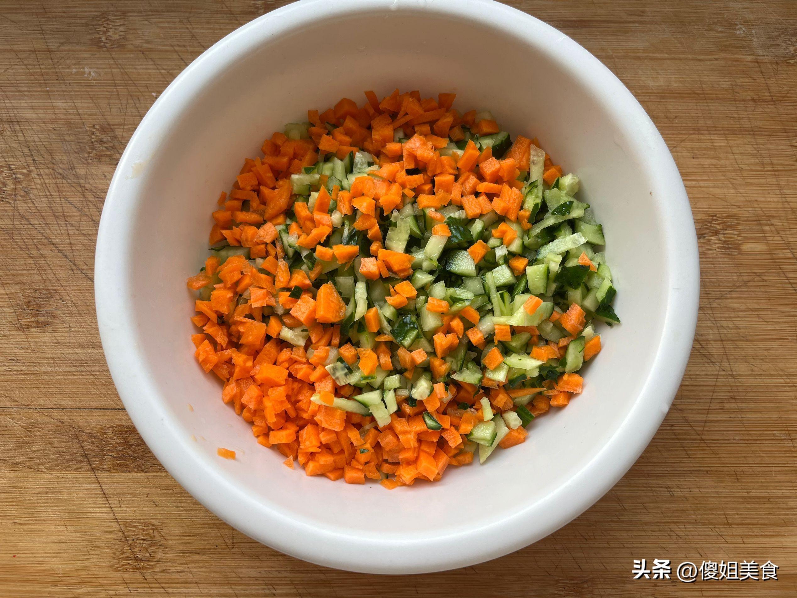 首先準備一些炒飯的配菜,我家孩子們都喜歡喫黃瓜、胡蘿蔔,這樣搭配起來色澤很好看,也特別的有食慾,還營養。準備一根新鮮的黃瓜洗乾淨,改刀切成小碎丁,胡蘿蔔去皮後也切成小碎丁,把配菜放入小盆內備用即可。