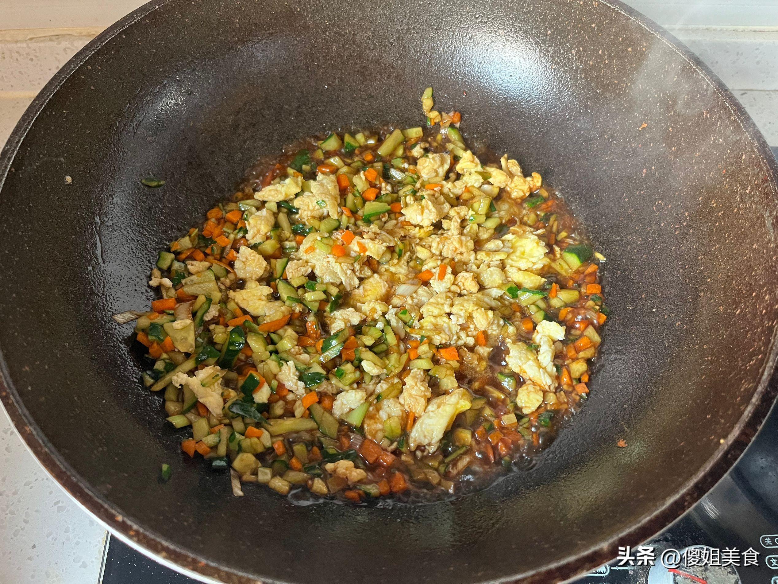 切一些蔥花熗鍋,把黃瓜丁和胡蘿蔔丁都倒入鍋內,放1勺味極鮮、1勺蠔油、少許雞精不停翻炒,然後倒入雞蛋,把所有食材炒入味。