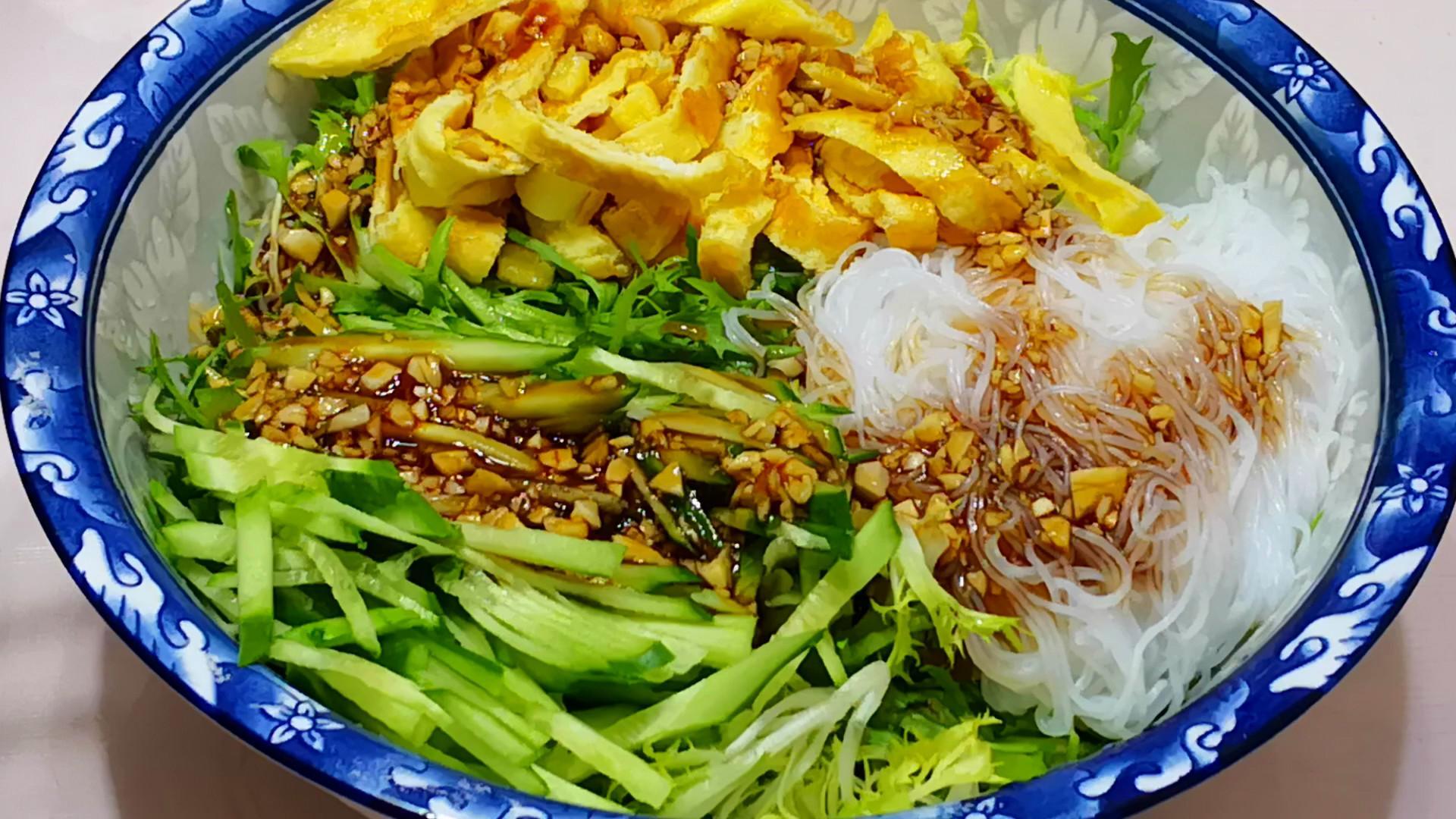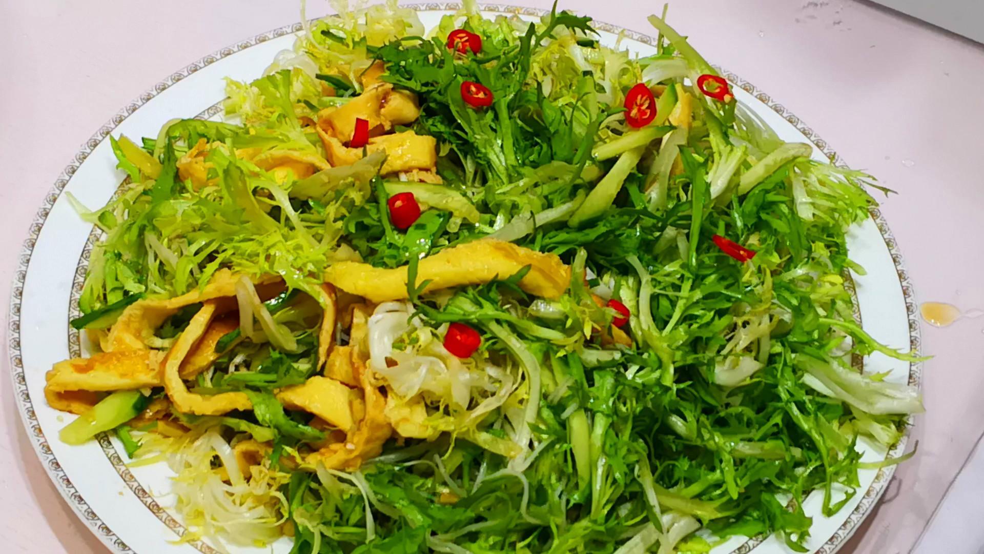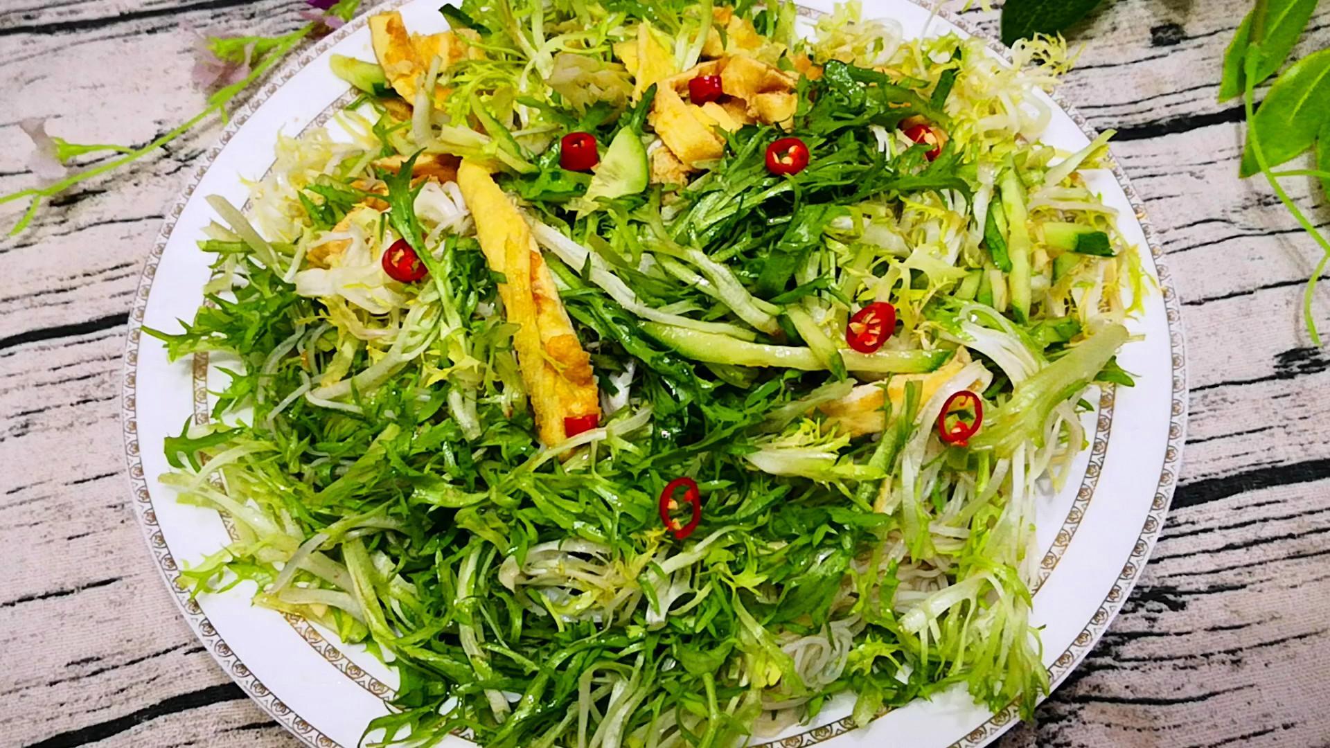 5、拌苦菊:把苦菊、粉絲、黃瓜絲和雞蛋絲放到一起,倒入調好的碗汁,攪拌均勻後裝盤,美味即成!