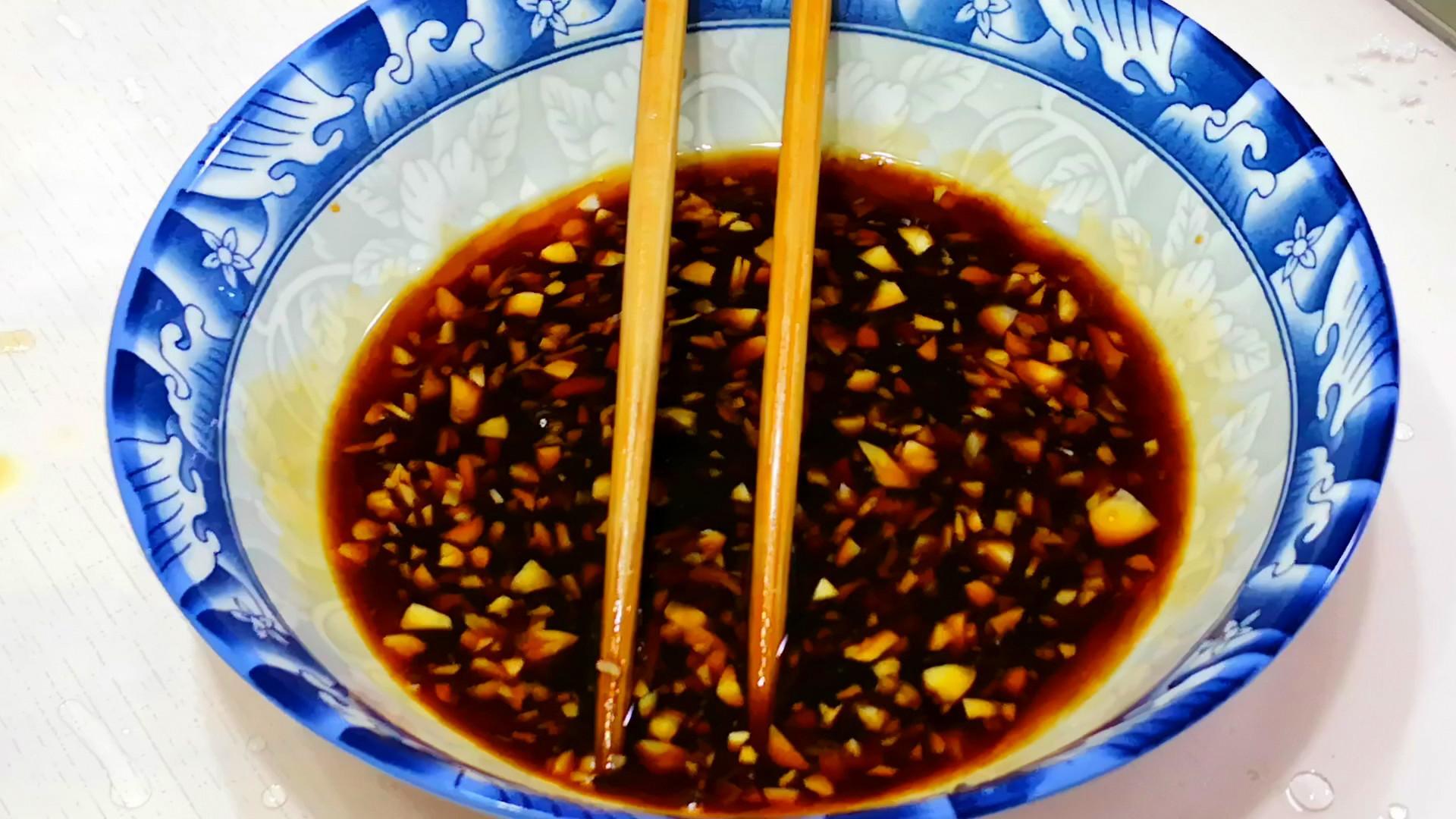 4、準備料汁:碗內加入一小勺鹽、一勺蠔油、一勺白糖、適量的味極鮮和米醋,充分攪拌均勻後倒入蒜末和小米辣。