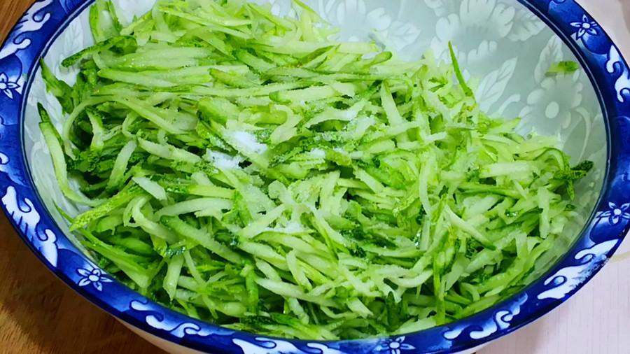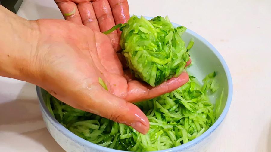 這一步用的黃瓜如果很老,切記要把黃瓜瓤和籽去掉,如果放到餡裏,調好的餡料會發酸,口感不好。