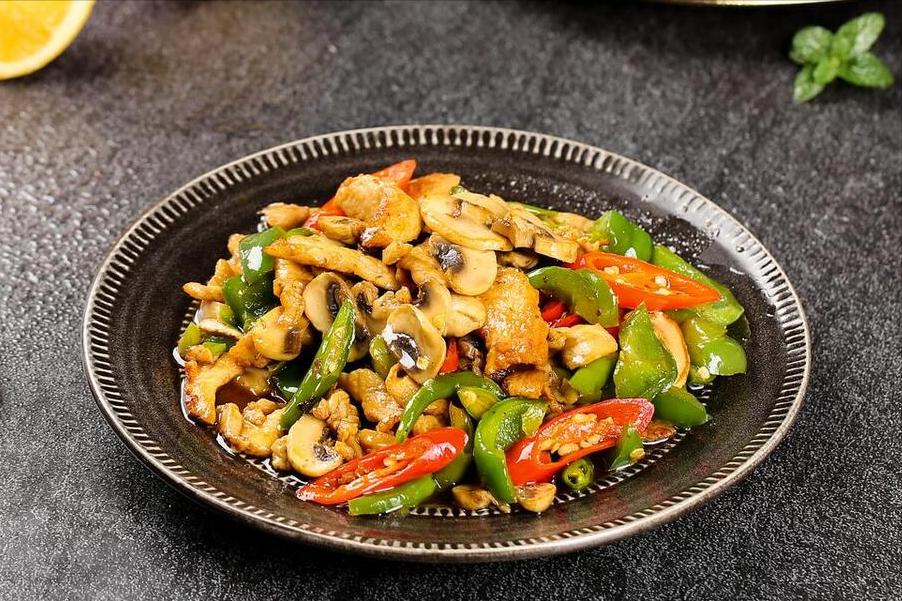 3、隨後利用鍋內剩下的油,把蒜片炒香,然後將口蘑倒進去翻炒,炒到變軟、斷生以後,再把瘦肉重新倒進去,這個時候來調味,加上適量的生抽、老抽、蠔油、鹽、味精調味,繼續翻炒一陣子,徹底炒勻後,就可以出鍋啦。