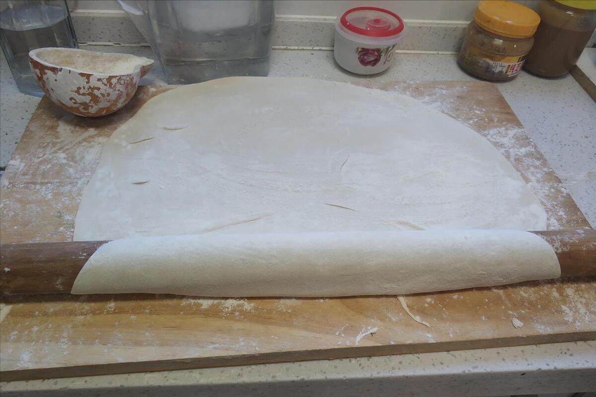 5、醒發之後的麪糰會更加有筋性,大概醒發30——40分鐘的時間就可以了,然後繼續來揉搓,揉搓一會兒就可以用擀麪杖擀成面片了,擀好之後表面撒上一點乾麪粉,然後用刀切成絲狀。