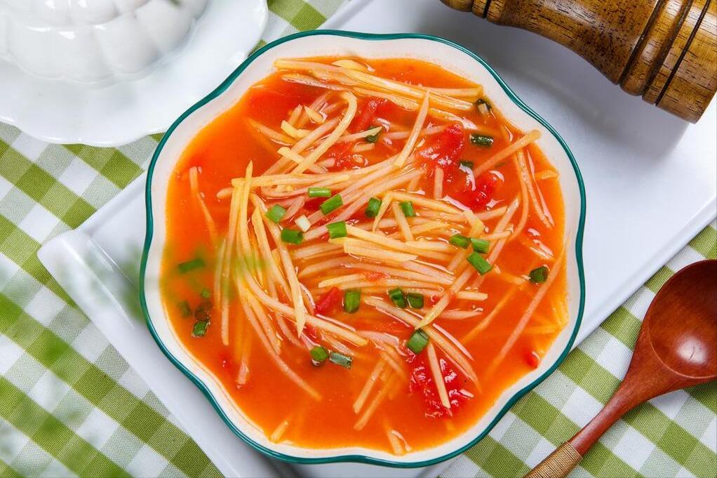 食材:西紅柿、土豆、蔥花、大蒜、鹽、雞精、食用油