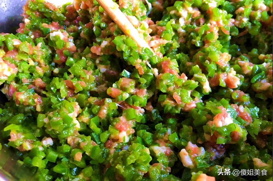 - 調製餡料:在豬肉餡中加入青椒末、薑末和蒜末,攪拌均勻。然後加入醬油、料酒、鹽和雞精,繼續攪拌,直到餡料上勁。