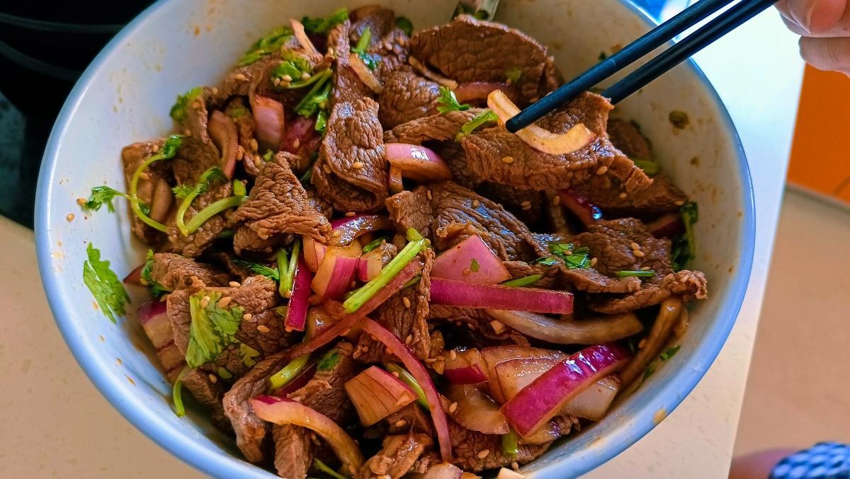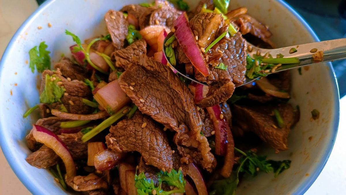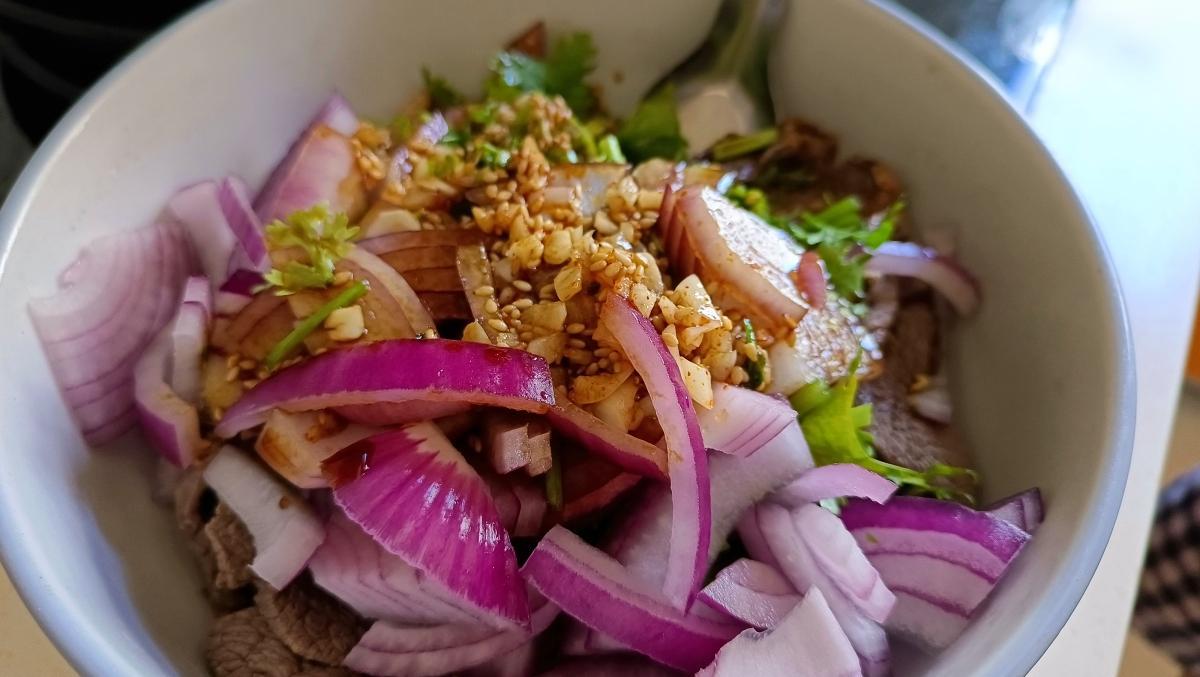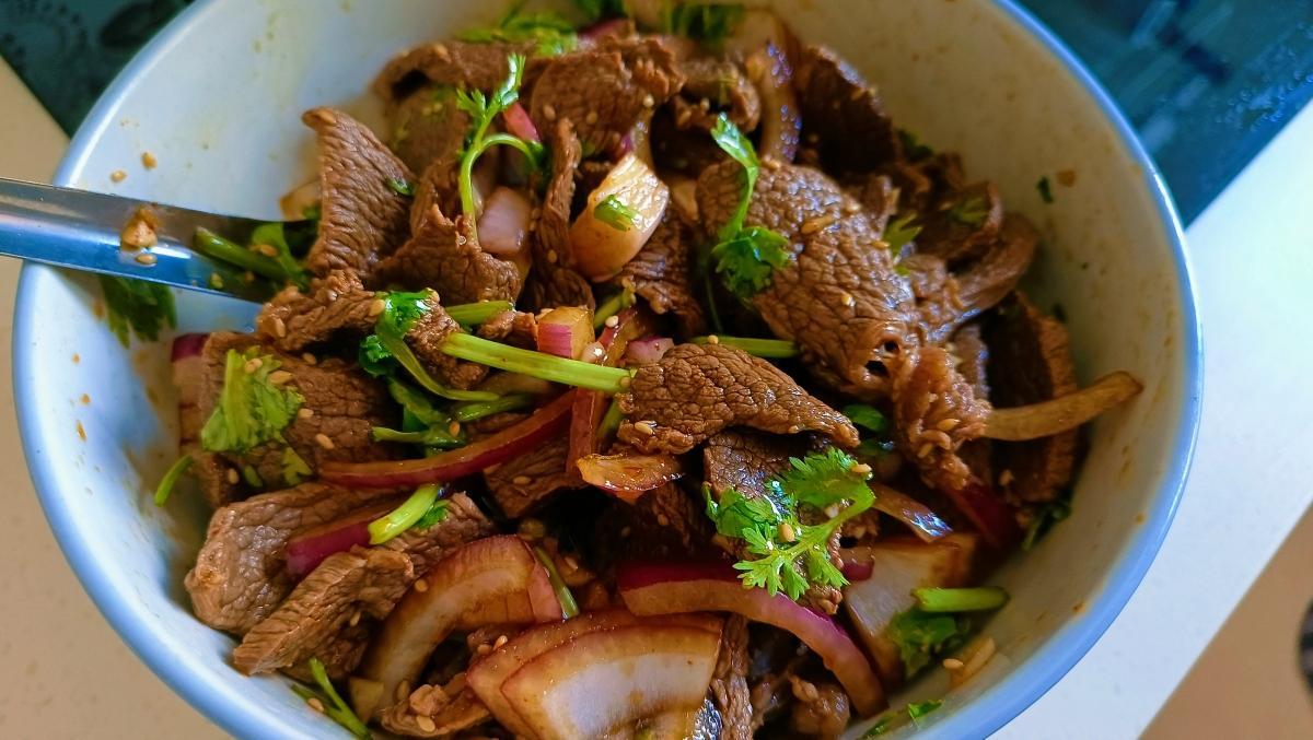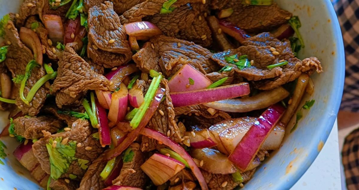 【涼拌牛肉】:牛霖一塊 洋蔥一半 香菜兩棵 生抽 雞精 陳醋 食鹽 香油 辣椒麪 熟芝麻各適量
