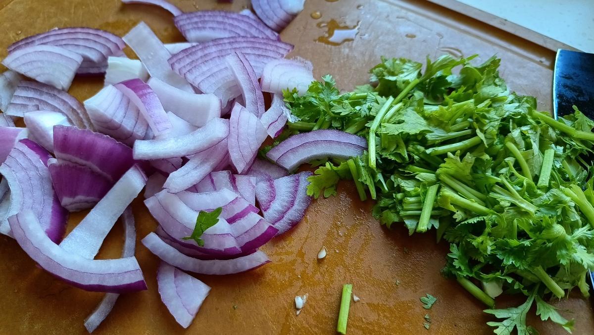 3.取一半洋蔥切成洋蔥絲放入大碗中備用;再取幾根香菜洗淨後切段也放入大碗中。